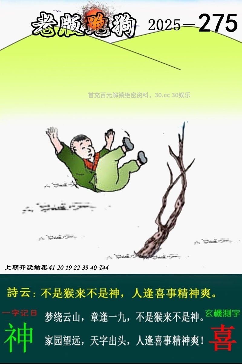 278期:【老跑狗特码诗】开【虎28】 玄机詩雲:開山劈地成六道,提防仆跌急扶持。夢中稱霸,不如醒爬。開山劈地成六道。小人得誌,毋須驚訝。提防仆跌急扶持。 诗句解:開山劈地成六道解地肖鸡羊狗鼠蛇虎。 |